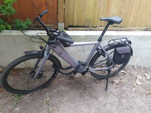 Not too complicated either. Sleek battery in frame design and hub drive. Rubber toothed belt, no chain and a comfy ride position. Two speeds, two assistance powers. Phone mount and pannier rack.